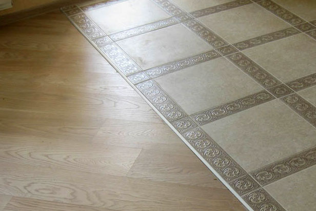 - если паркетная доска приходит к плитке торцом, то возможная деформация будет минимальной и можно оставлять технический зазор шириной 3-5 мм;